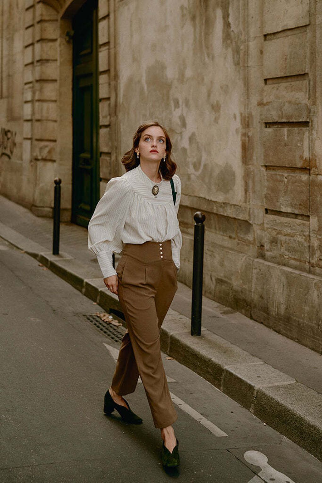愛德華時代風格的條紋襯衫,充滿典雅的女性氣質。褶皺過肩流入襯衫衣身,通過溫和的泡泡袖增加額外的體積,打造優雅的外觀。採用輕盈透氣面料,寬鬆版型。搭配可拆卸領結,可簡約可甜美,打造百搭造型。